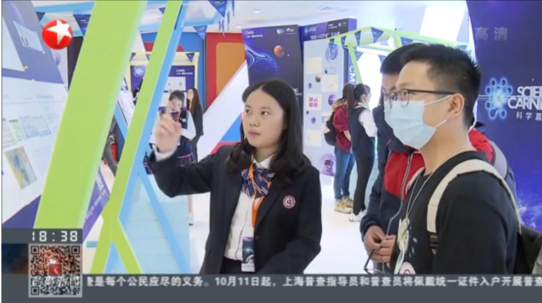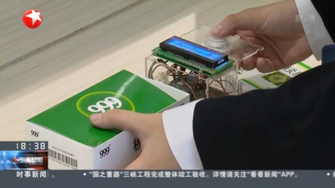 魏齊欣在互動(dòng)展上展示設(shè)計(jì)的“智能醫(yī)藥識(shí)別系統(tǒng)”,并與觀眾交流 圖|東方衛(wèi)視