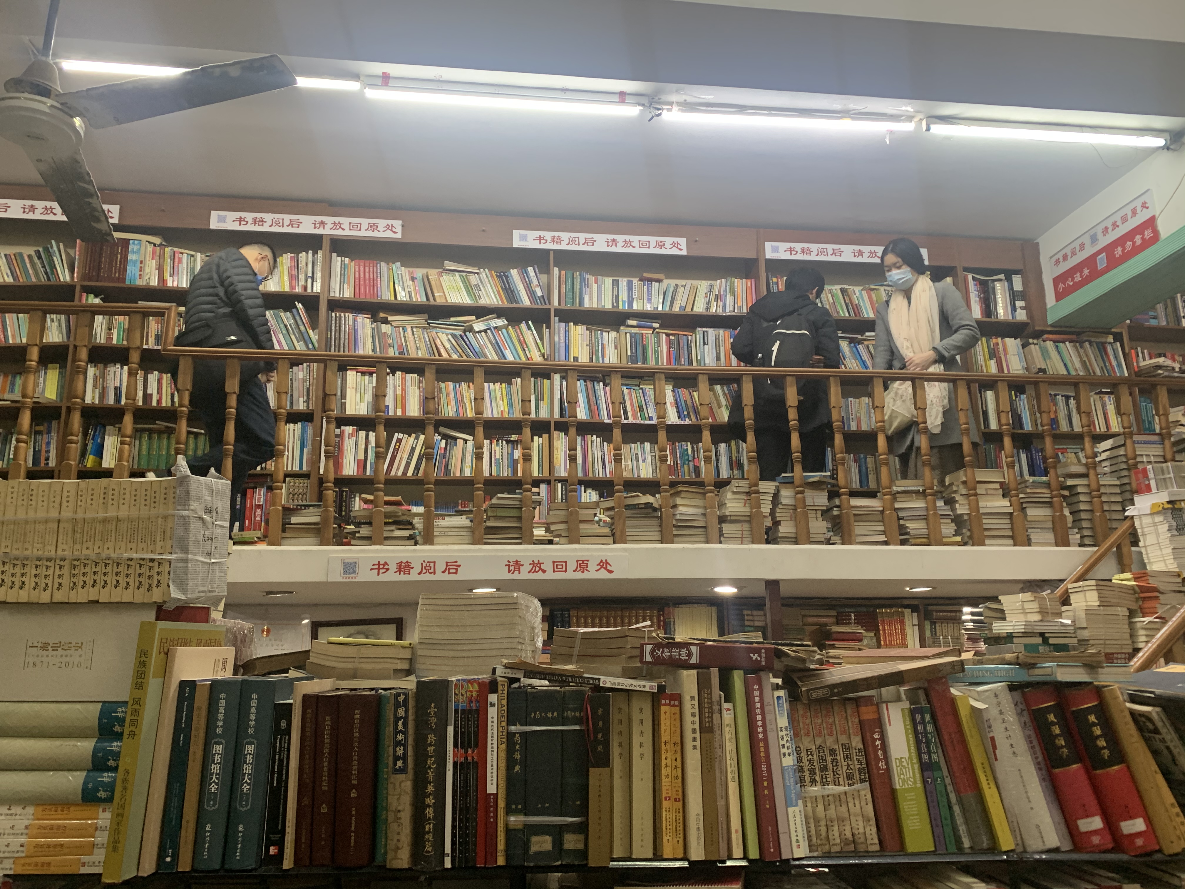 復(fù)旦舊書店藏在菜市場(chǎng)二樓的角樓里,是復(fù)旦學(xué)子、新老讀者20多年的舊友。12月24日上午10時(shí)許,澎湃新聞?dòng)浾邅?lái)到了復(fù)旦舊書店。記者看到,狹小的復(fù)旦舊書店內(nèi)略有些擁擠吵鬧,七八名讀者正在店內(nèi)選購(gòu)書籍,街道和消防的工作人員正在店內(nèi)檢查安全設(shè)施。