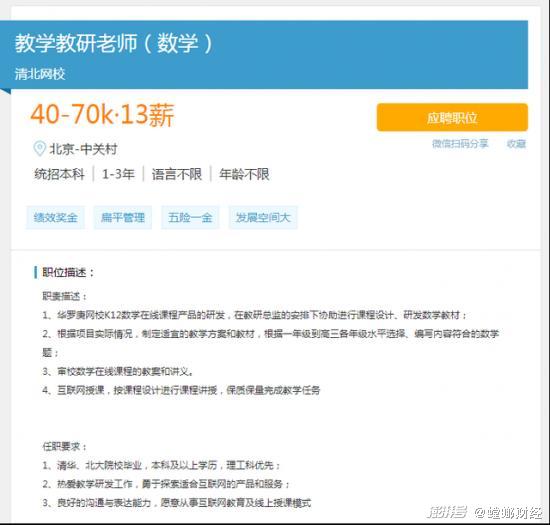 一邊是,字節(jié)跳動旗下的清北網校在招聘教師崗中明確規(guī)定要求清華、北大的畢業(yè)生,并提出將為優(yōu)秀教師提供“年薪兩百萬,上不封頂”的薪資待遇。