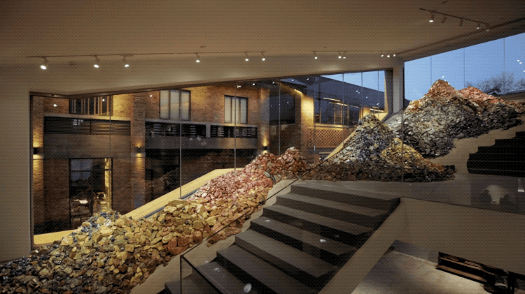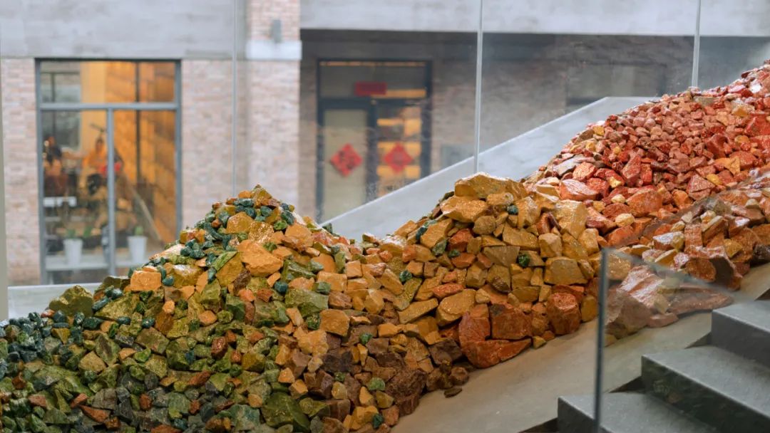 隔著通透的幕墻,在室外就能見到綿延的顏山裝置,是李顏珣用60幾種獨(dú)創(chuàng)的顏色,燒出來的一座小瓷山,剛剛完工,非常搶眼。