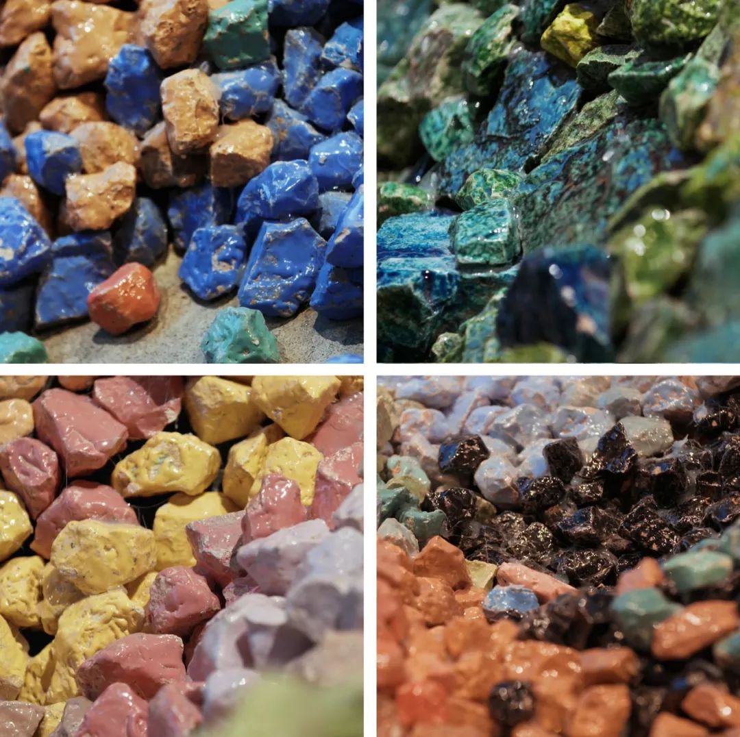 綿延近11米長(zhǎng),涵蓋60幾種色彩。原石直接1300度煅燒成瓷石,再用顏彩浸釉、上釉,經(jīng)過860度的燒烤,成為彩石。