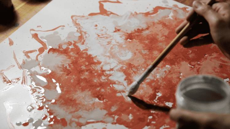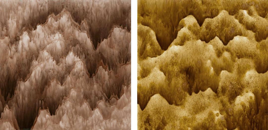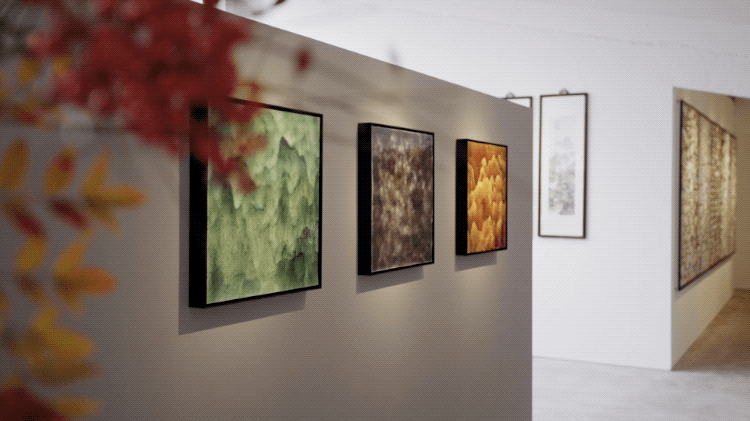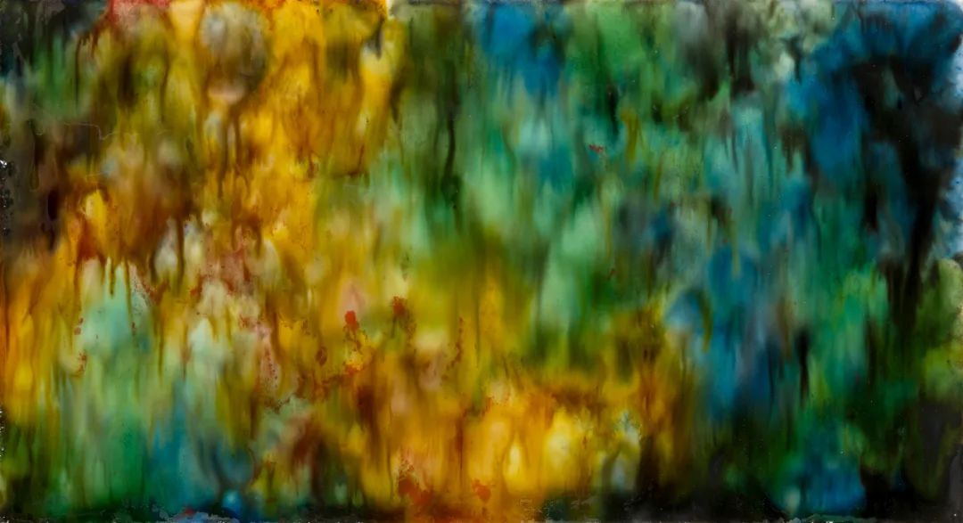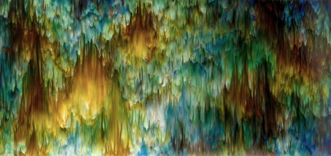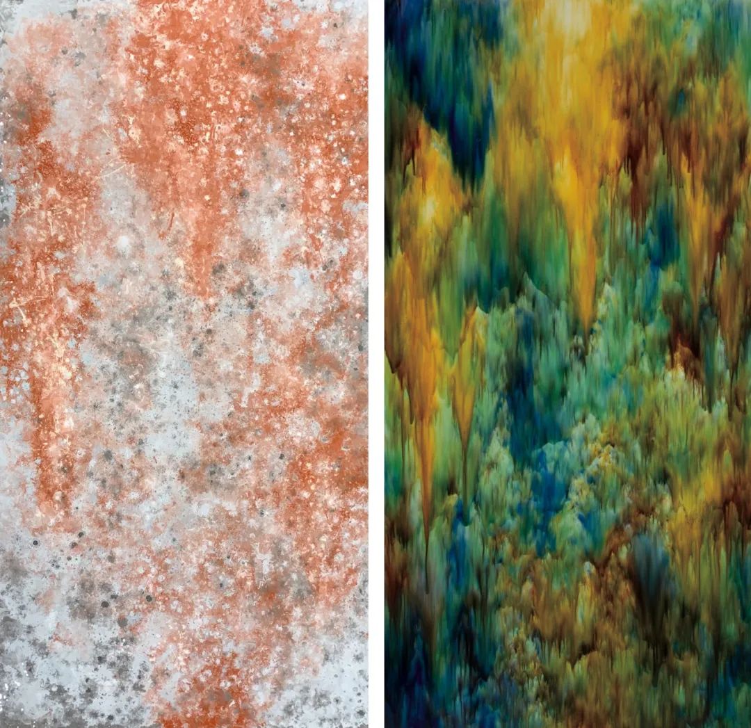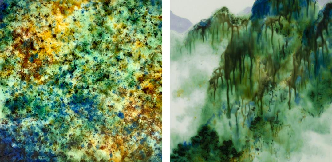 成品更是令人驚艷,脫離了具象的山水題材后,目之所及,只有肌理,只有色彩,只有材料。