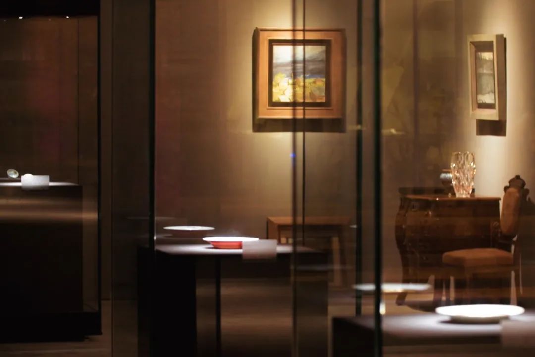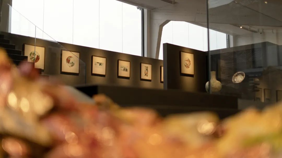 展廳分兩層,順著屋頂坡度劃分,一樓正在舉辦的是《粵海瑰華》,十八世紀(jì)廣州琺瑯彩特展,在眾多館藏展品中,有一件鎮(zhèn)館之寶清代康熙廣州琺瑯彩博弈圖杯,是大英博物館的瓷器珍品的同款。