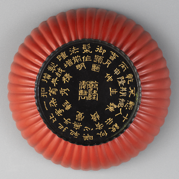 下面的一件菊瓣形朱漆盒,呈菊花瓣形,通體髹朱漆,外底髹黑漆,刀刻填金隸書乾隆皇帝御制的《詠朱漆菊花盒》詩一首:“髹作法前明,踵增制越精。攢英如菊秀,一朵比花輕。把手初無覺,映心似有情。設(shè)云十人諫,慚愧不期生?!?/span>末署“乾隆丙申仲春月御題”及“比德”印章款。底中部有“乾隆年制”篆書款?!氨辍笔乔∷氖荒?。盒壁厚約一毫米,胎薄體輕,采用夾纻胎技法制成。此種技法是用漆或漆灰將若干層布糊裱在一起,又稱“脫胎”,具有堅實輕巧的特點。