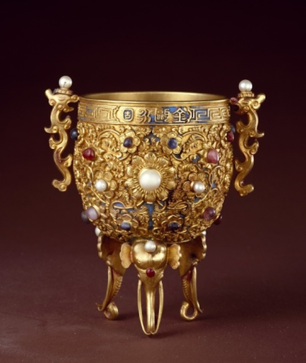 金甌永固杯,口沿中部鏨篆書“金甌永固”,另一面鏨“乾隆年制”四字款。外壁滿鏨寶相花,花蕊以珍珠及紅、藍寶石為主。兩側(cè)各有一變形龍耳,龍頭上有珠。三足皆為象首式,額頂及雙目間亦嵌珠寶。金甌永固杯是乾隆皇帝在每年新年明窗開筆時飲屠蘇酒所用。