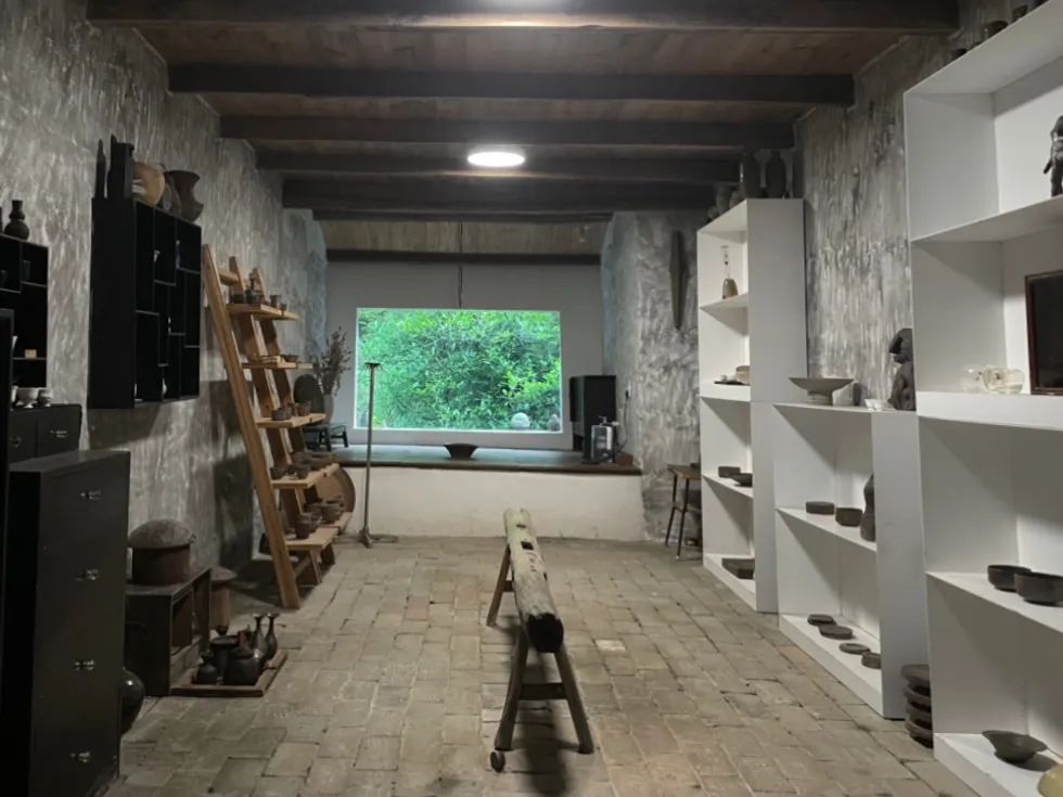 其弈和陳知音的工作室在一個(gè)離陶藝街較遠(yuǎn)的山野村莊,流坑塢。他們租下了一樁民房將其改造成自己的陶藝工作室,整棟房子都是木質(zhì)結(jié)構(gòu),門口就是大片的綠野。夕陽(yáng)照進(jìn)來(lái),有種遼闊深遠(yuǎn)的感覺。房子不小,多余的兩間做了民宿,還有一間展廳和周末咖啡館。