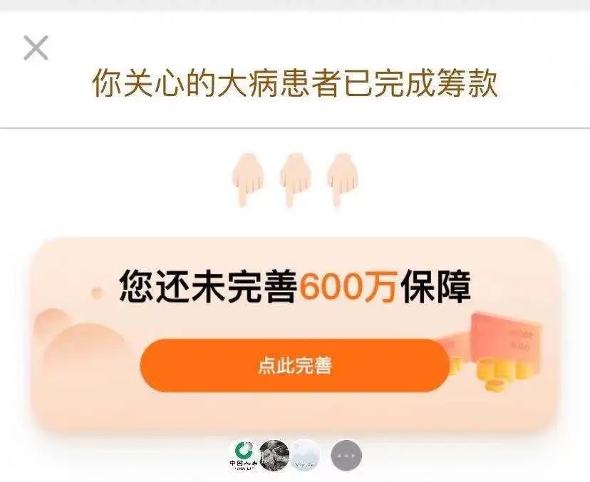 例如,在用戶完成捐款后,會彈出標有“您還未完善600萬保障”的頁面,完善的方式,就是進入醫(yī)療險購買頁面。