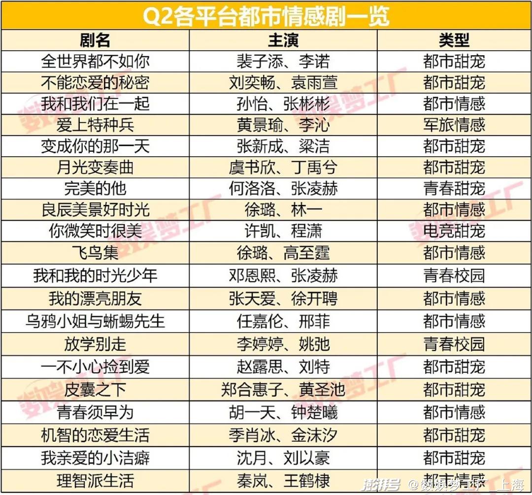 在整體較為低迷的環(huán)境下,當(dāng)代都市情感劇成了Q2的主力,Q2共有20部作品播出。