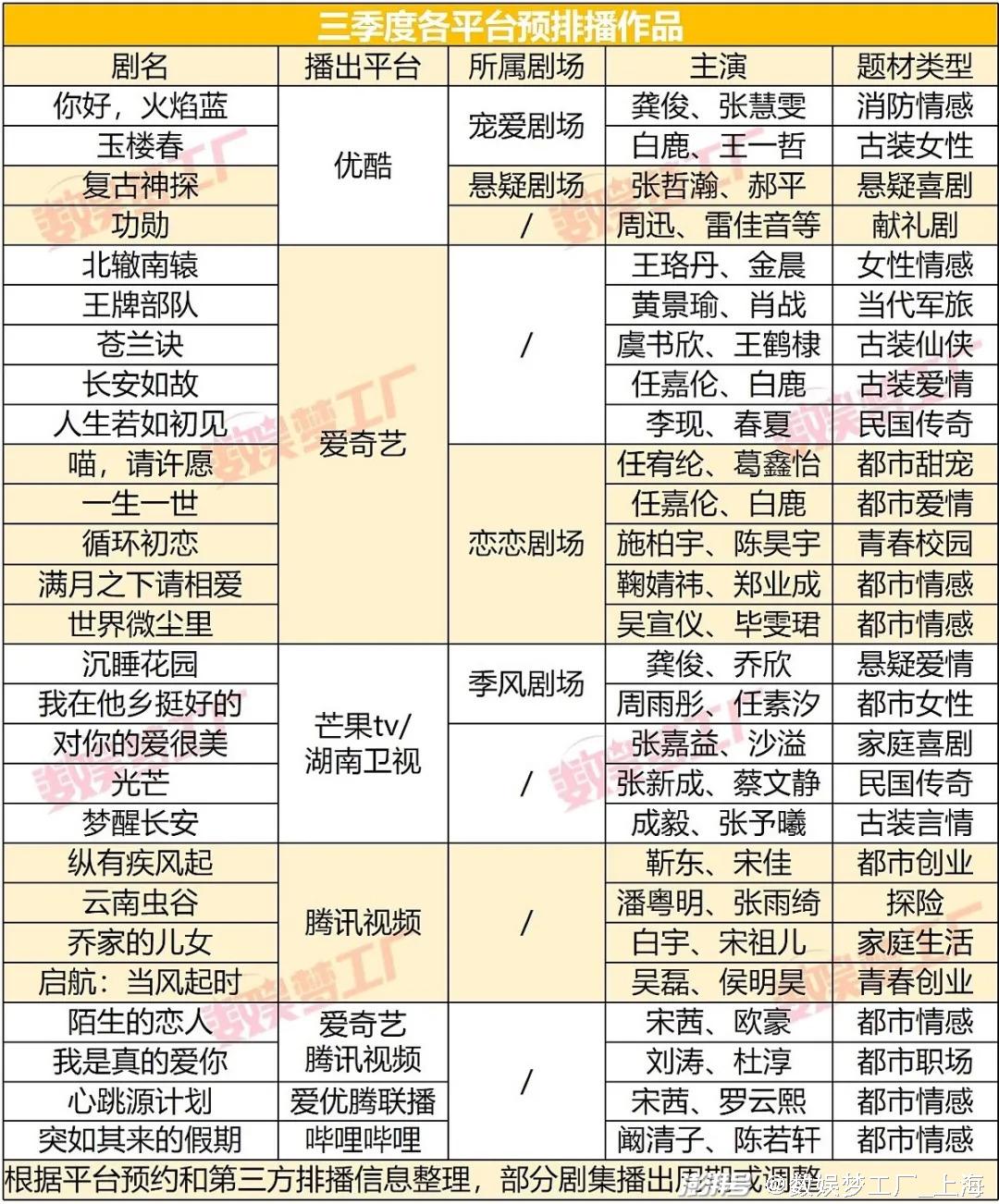 從目前各大平臺(tái)的排播情況觀察,戀戀劇場(chǎng)、寵愛(ài)劇場(chǎng)還將繼續(xù)順延到Q3,此外Q3也不乏大體量的現(xiàn)實(shí)題材作品,包括不少名導(dǎo)的電視劇新作。