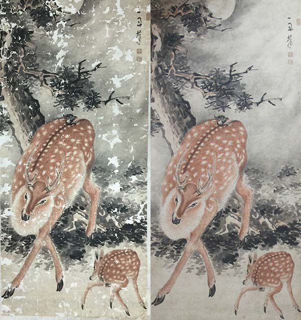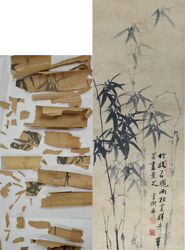 比如,這一張《墨竹圖》,最初展現(xiàn)在修復(fù)人員面前的是一些看似殘破的紙片,像是一組被無序排列的拼圖,而后根據(jù)修復(fù)人員自身積累和對傳統(tǒng)藝術(shù)作品的認(rèn)識,對畫心碎片進(jìn)行拼接、揭去舊裱,補(bǔ)洞、全色接筆,賦予作品新生。這一張畫的難點在于“全色”修復(fù)師要調(diào)制比畫芯略淺的色彩,然后一點點地在原畫作上注色,注入的顏色必須與原畫的色彩一致,以求達(dá)到整幅畫的色彩渾然一體。對于損毀的畫面還需要根據(jù)相關(guān)“考據(jù)”按原作者的思路、筆法、構(gòu)思等要素帶著敬畏心地在破損處進(jìn)行還原和修復(fù)。現(xiàn)在國內(nèi)大多采取的是相對保守的修復(fù)方式,所以對于難以考據(jù)的作品,做暫不修復(fù)處理。