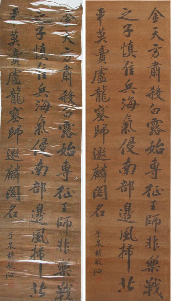 走入展覽現(xiàn)場,引觀眾最多駐足的是清末楊毓泗(1864年-1921年)的絹本書法作品的修復(fù),這張作品在修復(fù)前最顯而易見的問題是出現(xiàn)了絹絲斷裂、折疊,對此修復(fù)師用針錐小心翼翼地將經(jīng)絲一根一根撥回原位。此外,經(jīng)過修復(fù)人員花費近三個月的時間 “妙手回春”般補(bǔ)洞、矯正之后,這件作品基本還原了當(dāng)時的面貌。(文末附修復(fù)過程)