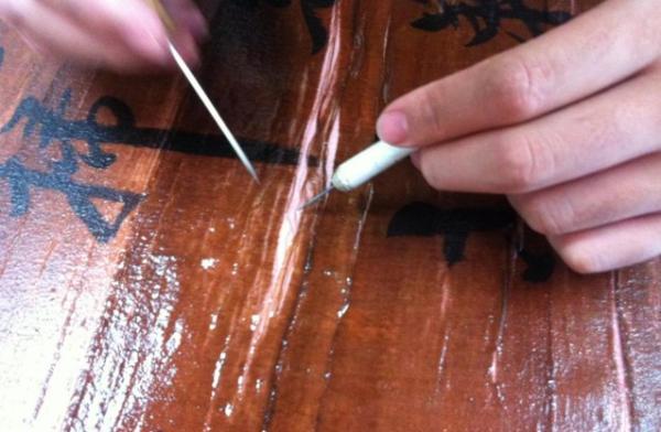 處理畫芯:清洗畫芯、整理絹絲、挑刮污漬(修復(fù)師用毛筆、鑷子等工具一點點涂抹畫面上的霉斑等污漬。)