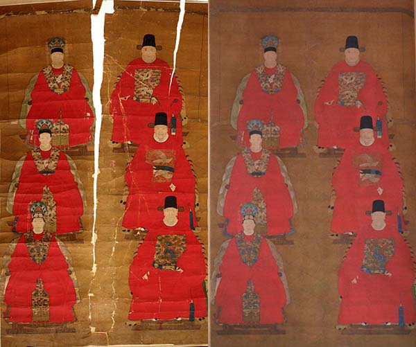 此幅修復(fù)作品為《六人祖宗像》,祖宗像又叫“像圖”。這種藝術(shù)作品流傳于明清兩代,明以前稱為“功臣像”。 此畫繪有身穿明代朝服的三男三女。從其著裝看出官職的品級與社會地位,畫面精細(xì)是難得的精品。但原畫多處斷裂、斷痕、顏色剝落、缺損,有過重裝裱修補(bǔ),這就需要修復(fù)人員尋找到顏色、結(jié)構(gòu)和表面包漿和原畫盡量一致的絹,并用小筆著顏色一點一點啄補(bǔ)全裂縫。
