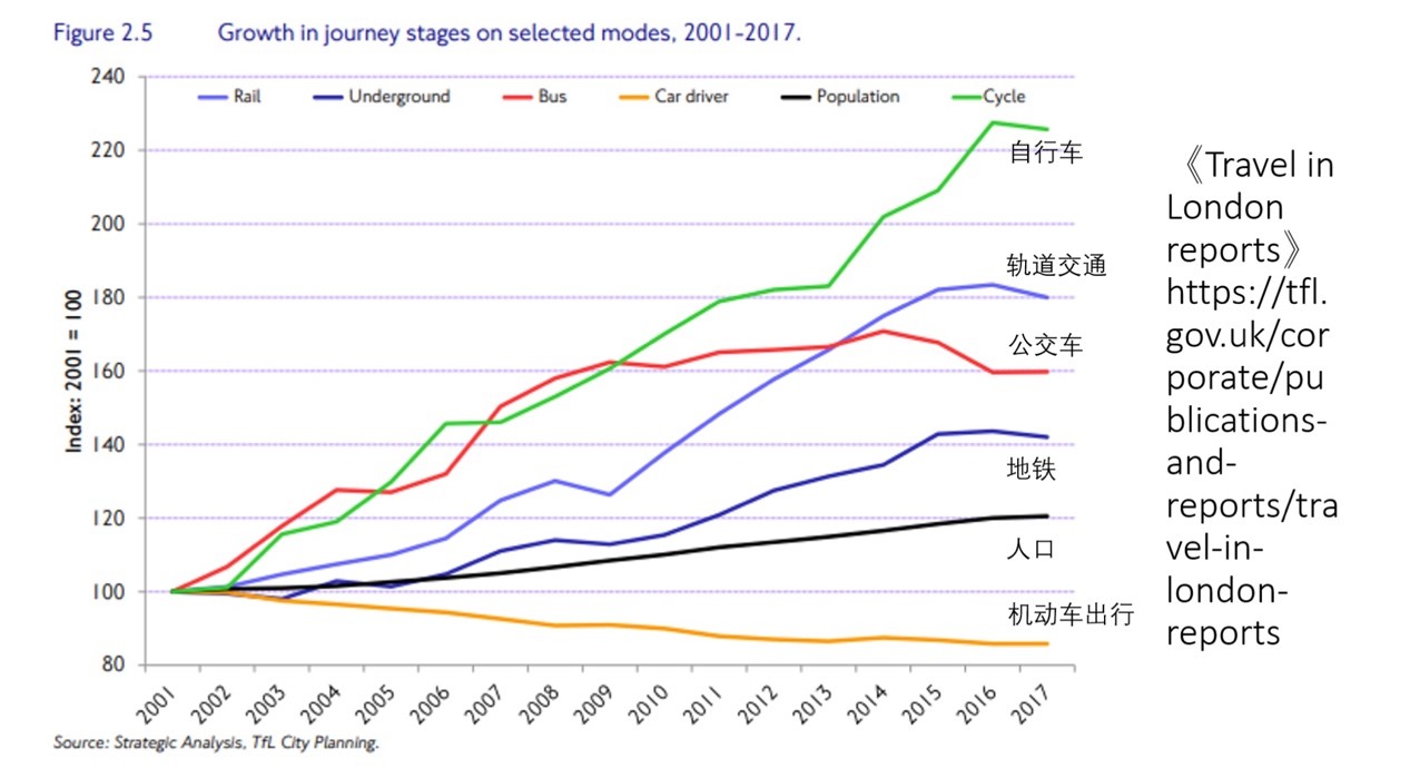 我特別喜歡這張英國(guó)的數(shù)據(jù)圖。從2001年到2017年,城市人口增加了20%,但機(jī)動(dòng)車的出行量減少了17%,自行車的使用量增加了120%,所有的公共交通都在增加。這種改變過(guò)去五十年中在幾乎所有歐洲城市中一直發(fā)生著。一位叫比特利的美國(guó)記者在他的專著《綠色城市主義——?dú)W洲城市的經(jīng)驗(yàn)》記錄了這一進(jìn)程,并號(hào)召美國(guó)城市規(guī)劃師向歐洲城市學(xué)習(xí)。