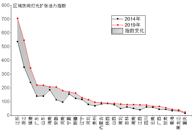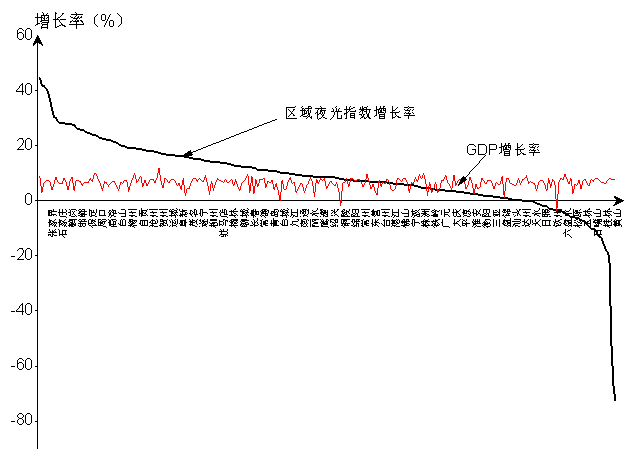 由于夜間燈光數(shù)據(jù)不存在價(jià)格因素或者核算范圍的影響,并且隨著衛(wèi)星精度的提高,可以更廣泛地采集到一些傳統(tǒng)經(jīng)濟(jì)統(tǒng)計(jì)中未能涵蓋的經(jīng)濟(jì)活動(dòng)信息,尤其是人口的空間分布和一些數(shù)字化的服務(wù)業(yè)。因此,夜間燈光強(qiáng)度的變化相比傳統(tǒng)經(jīng)濟(jì)指標(biāo),更有利于反映一個(gè)地區(qū)人口集聚和經(jīng)濟(jì)活力的真實(shí)情況。