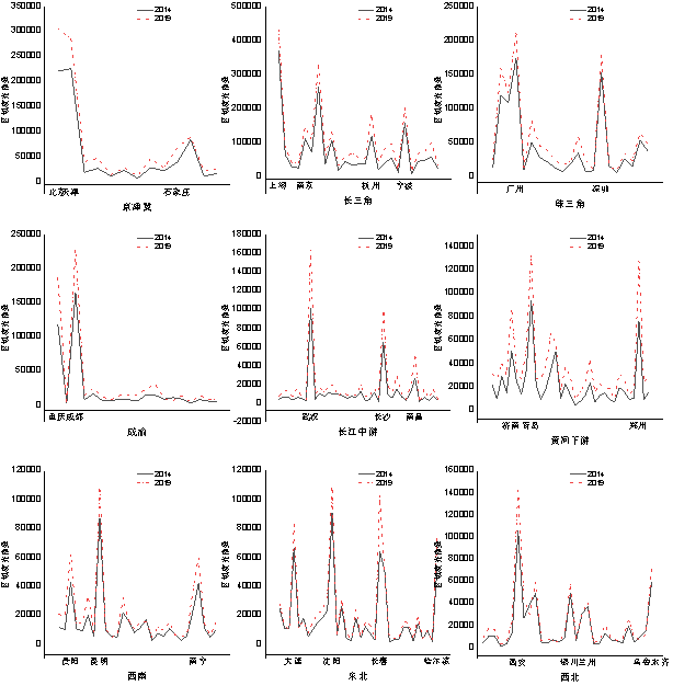 圖4 部分中心城市與周邊地區(qū)區(qū)域夜光指數(shù)的比較(2014年和2019年)