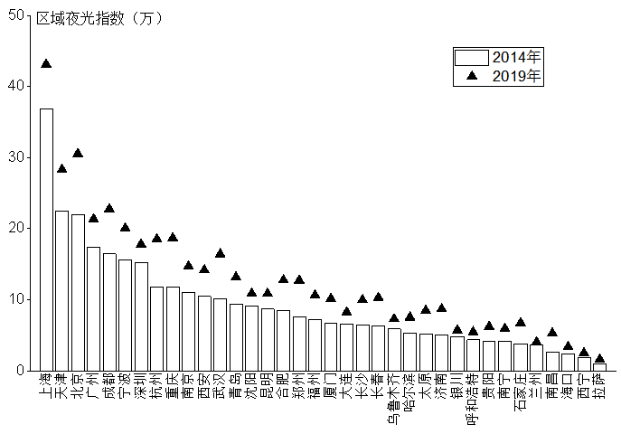 圖3 2014年和2019年中國(guó)36個(gè)中心城市區(qū)域夜光指數(shù)的比較