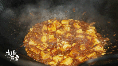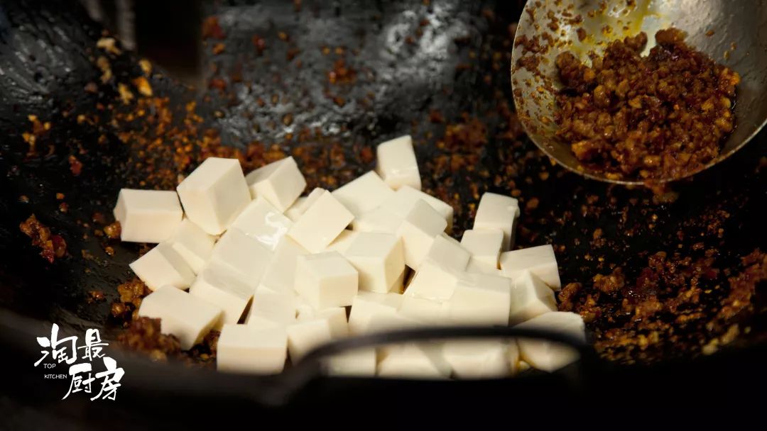 肉末醬汁全部包裹住豆腐,收汁才算到位。