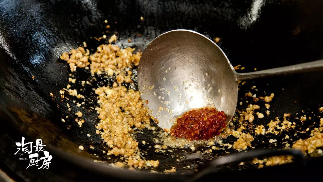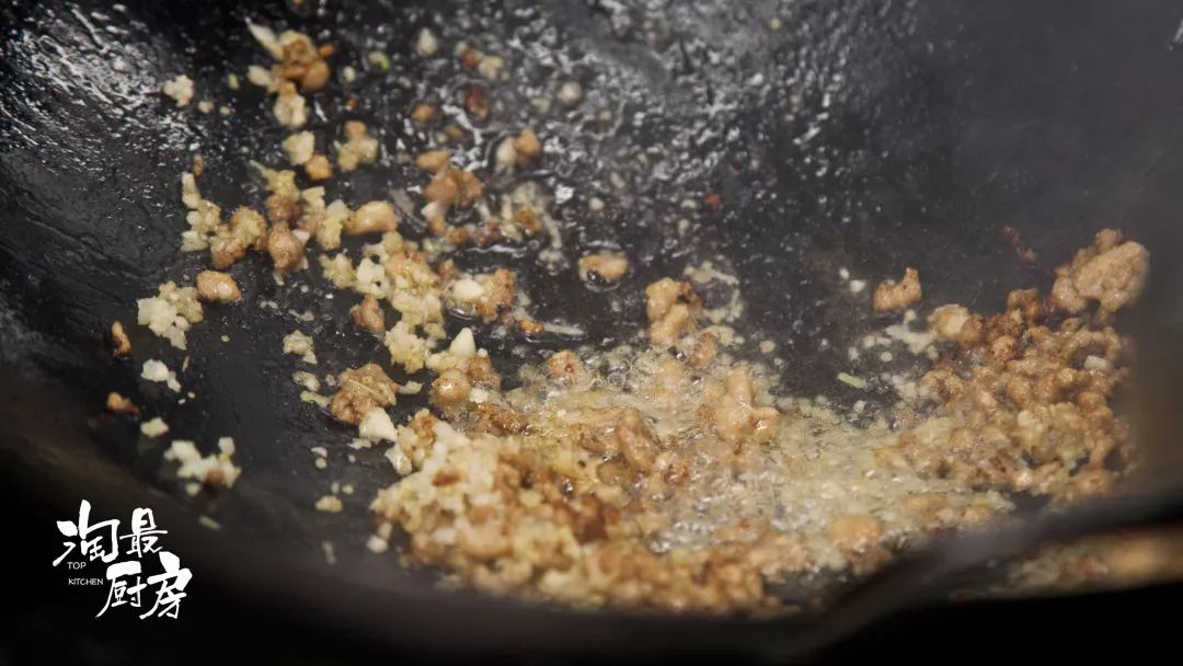 熱鍋冷油,煸熟豬肉末后下姜、蒜和料酒炒香。