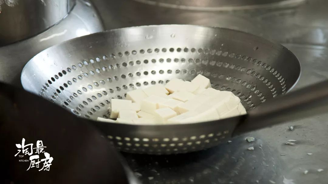 豆腐不焯水,燙一下,防止炒制時(shí)變爛。