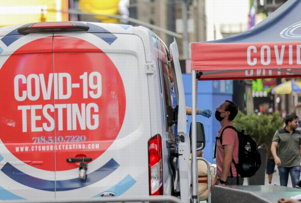當(dāng)?shù)貢r間2021年8月31日,一名男子在美國紐約時報廣場的流動新冠檢測點接受新冠病毒檢測。