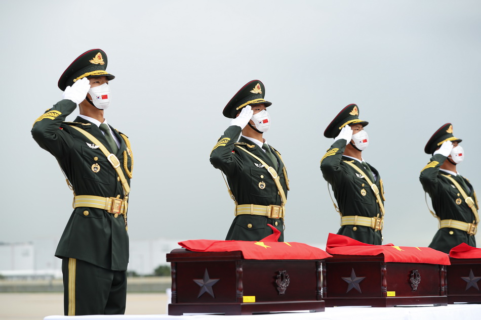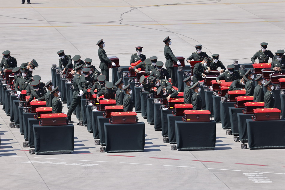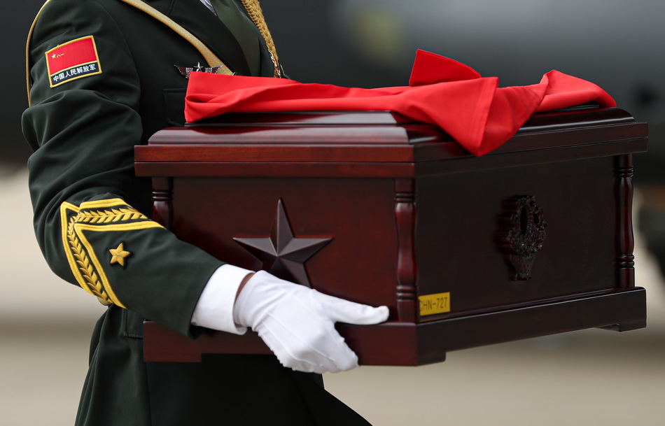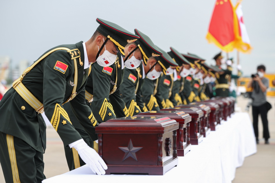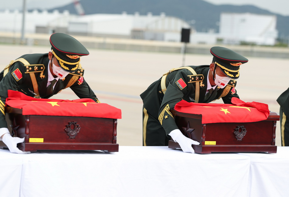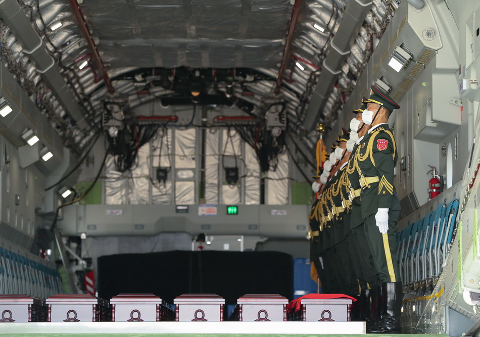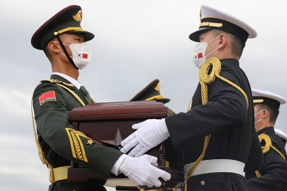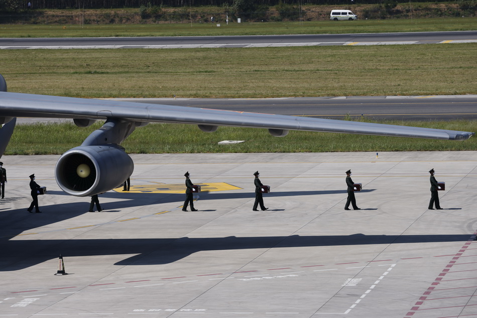 中韓雙方代表現(xiàn)場(chǎng)簽署交接書,確認(rèn)交接109位在韓中國(guó)人民志愿軍烈士遺骸及1226件相關(guān)遺物。中國(guó)駐韓國(guó)大使邢海明為志愿軍烈士棺槨覆蓋國(guó)旗,中方舉行悼念儀式,在場(chǎng)人士向烈士遺骸三鞠躬。隨后,禮兵手捧烈士棺槨登上空軍運(yùn)-20專機(jī),啟程返回祖國(guó)。
