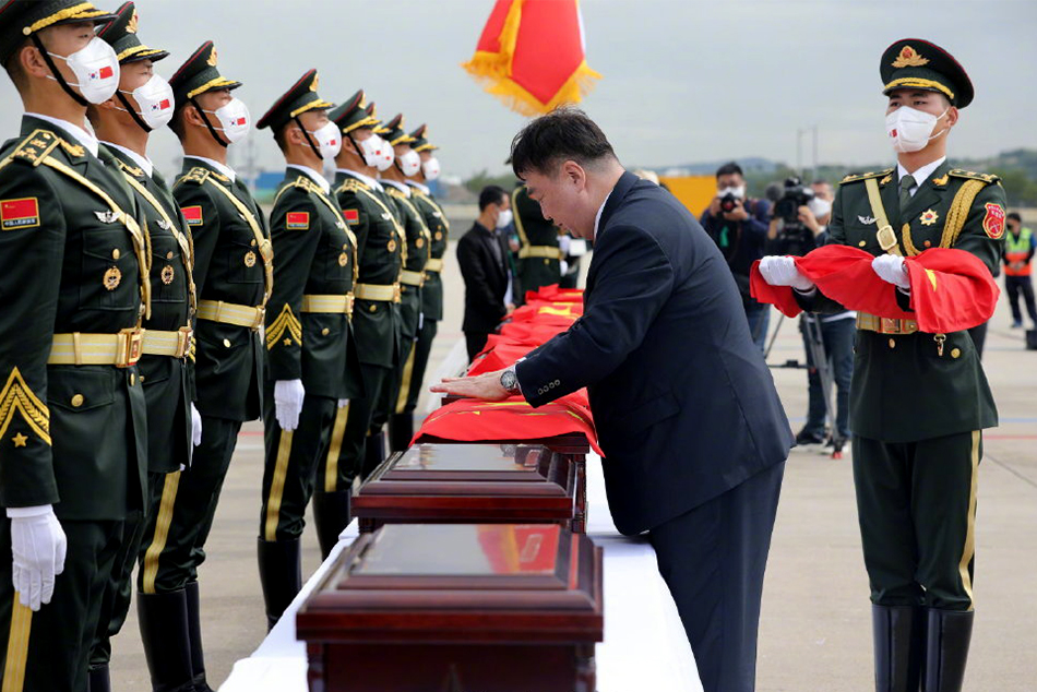 2021年9月2日,韓國(guó)仁川國(guó)際機(jī)場(chǎng),中國(guó)駐韓國(guó)大使邢海明為志愿軍烈士棺槨覆蓋國(guó)旗。