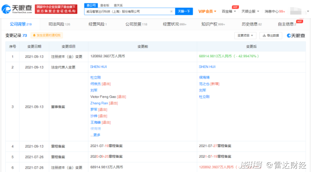據(jù)天眼查,9月13日,威馬智慧出行發(fā)生多項工商變更,其注冊資金由12.09億元縮水至6.89億元,原來多達12名的董事團隊有9人退出。
