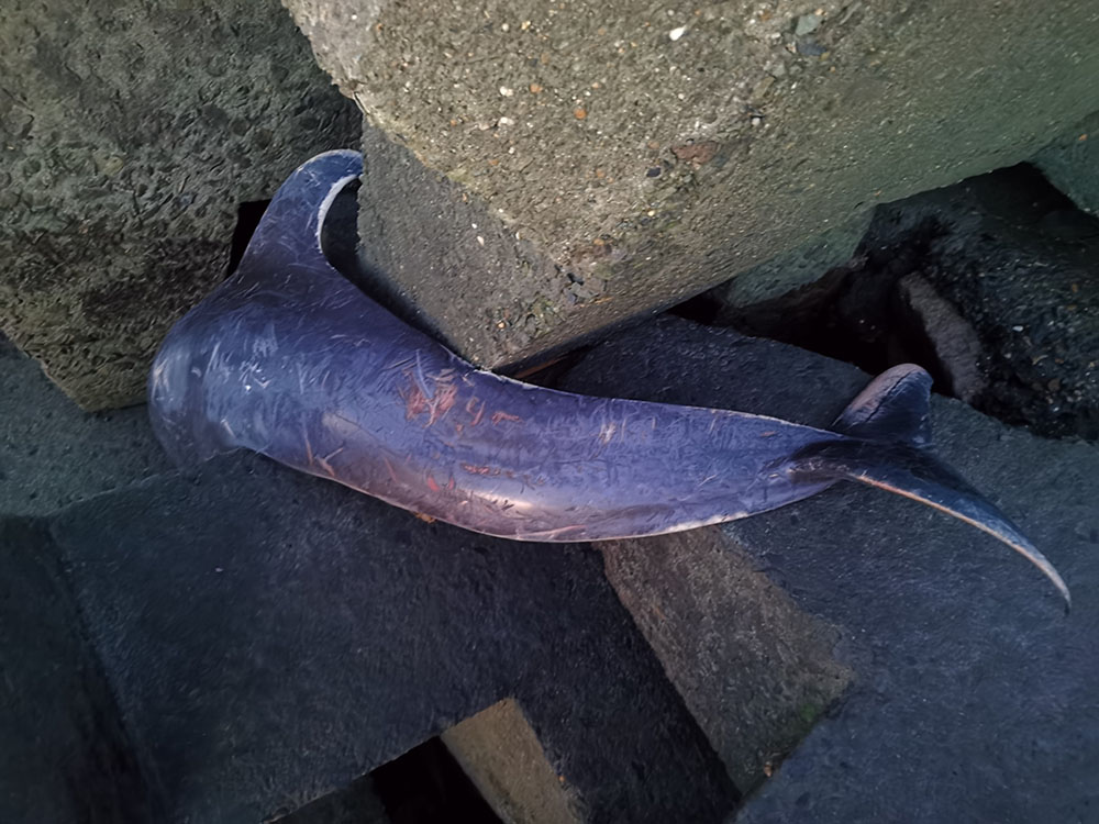 10月4日凌晨3點40分,搜救小組沿著漕涇發(fā)電廠煤碼頭上下游各約3公里開展搜救,于凌晨5點15分,在石頭縫里發(fā)現(xiàn)第一頭疑似瓜頭鯨,但已死亡。