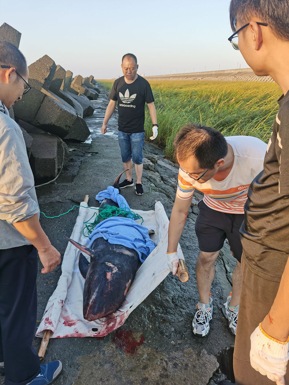 第二、三、四條瓜頭鯨,由于發(fā)現(xiàn)時間稍晚,早上漲潮迅速,搶救時間不夠,6點30分潮水淹沒了尸體,未能及時成功吊裝運輸。