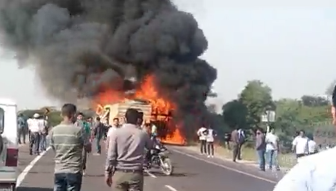外媒:印度一大巴與油罐車相撞后起火,至少12人死亡