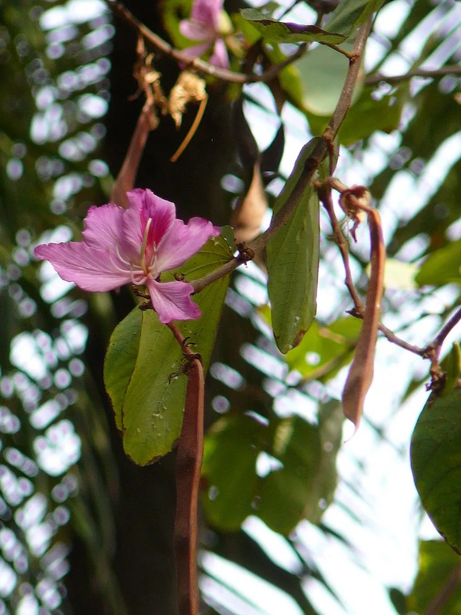 如果能看清的話,這兩者的區(qū)分在于花序:宮粉羊蹄甲花序極短,紅花羊蹄甲花序很長。另一個(gè)重要差異則是果實(shí):宮粉羊蹄甲能夠正常地開花結(jié)果;但紅花羊蹄甲是羊蹄甲和宮粉羊蹄甲的自然雜交后代,因親本的生殖隔離而無法結(jié)出果實(shí)。所以,如果樹上掛著果實(shí)的,肯定就是宮粉羊蹄甲了。