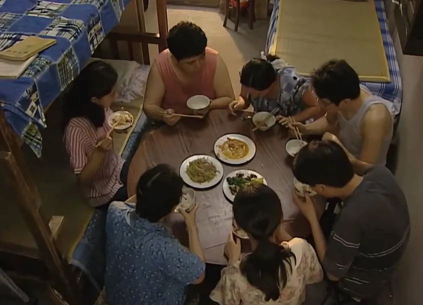 所以張的民一家子始終穿得很將就,尤其晚上吃飯時,全家都穿著咱大姑、咱老舅的舊衣裳:大T恤、跨欄背心、花褲衩子、趿拉板兒,氛圍感拉滿。