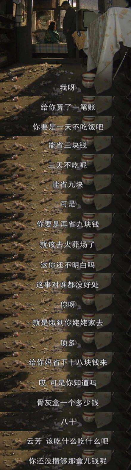 他有一套最原始的邏輯,理解生存和飲食的關(guān)系:三天不吃飯,能給家里省18塊錢,省36塊錢就得見馬克思,可是骨灰盒至少賣80塊錢。所以人死了不劃算,得吃飯。