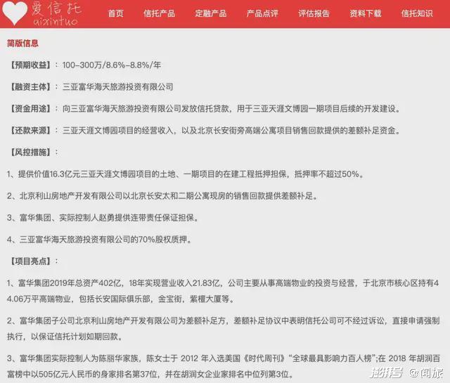 值得注意的是,企查查信息顯示,在2019年12月12日,三亞富華盛世投資曾將其所持有的三亞富華海天旅投全部股權(quán)出質(zhì)給光大興隴信托有限責(zé)任公司,而聞旅查詢發(fā)現(xiàn),在2020年2月,有募資網(wǎng)站發(fā)布名為“三亞文博園項目”的光大信托產(chǎn)品,以高達8.6%~8.8%的預(yù)期收益尋求募資。