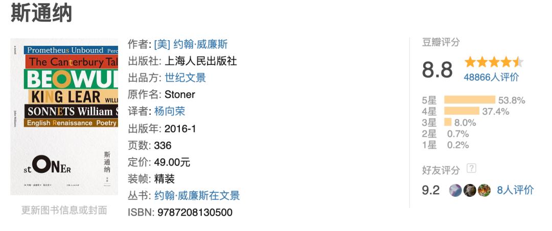 是想要讀好多好多遍的書。隨著文末“手指開始松軟,捏著的那本書慢慢滑動,然后快速越過他不動的身體,跌進房間的寂靜中”,陪老斯通納走過的一生,終于結束了。默默地不知道流了多少淚,直到最后跟著文字奇妙般地成為他靈魂的部分,我想他還是擁有了完整的自我,并且私自享有屬于自己的死亡的那一刻。關于死亡的書寫部分完全不輸托爾斯泰,人終有一死,若在那瞬間已完成了所有的期待,便會坦然罷。