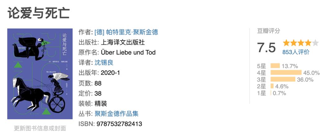 聚斯金德唯一非虛構作品,通過援引哲學神話等探討了愛與死亡的相生相伴與對立沖突。我整理了一些相關閱讀基于這個話題之上,希望能有更深入的探索。