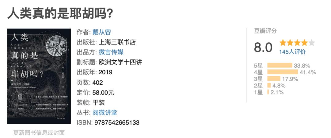 看得出我是很喜歡文學評論以及歷程描繪或閱讀寫作學習方面的書籍對吧,這本依然是歐洲文學十四講。耶胡是《格列佛游記》中虛構出的一種生物,從神話、戲劇到小說,從圣經、莎士比亞到黑塞,既深入文學,又跳出文學,解讀文學,探討人性。對我來說,也是一本填補知識的書籍,是有一部分工具功能的,也更加打開的視角,有了更多需要思考的靈感。
