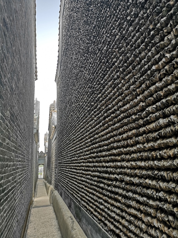 尤其是鄉(xiāng)村祠堂,為了維護(hù)方便,使用蠔殼更是常見(jiàn)。菉猗堂的兩側(cè)墻面,由排列整齊的碩大蠔殼砌成,厚達(dá)65厘米。墻身高大,進(jìn)深超過(guò)三十米,使用蠔殼近百萬(wàn)只,側(cè)面望去極為壯觀。這些歷經(jīng)六百年滄桑的蠔殼,至今仍然衛(wèi)護(hù)著菉猗堂。