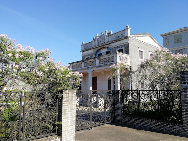 其中最搶眼的一座是毓秀洋樓,上世紀(jì)30年代由旅美華僑興建,建筑風(fēng)格中西合璧,古樸典雅。我第一次到訪時(shí),正是百花盛開(kāi)之時(shí),院墻伸出無(wú)數(shù)粉色花朵,映襯著這棟老房子。二樓陽(yáng)臺(tái)上方的牌子寫有“斗門縣”三字,標(biāo)示著它的舊日身份——上世紀(jì)60年代,這里曾是斗門建縣籌備組辦公樓。