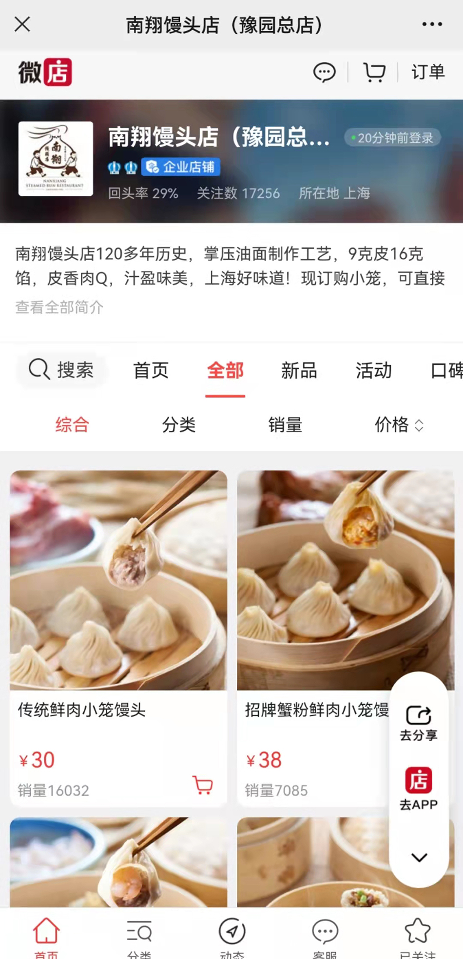 打開(kāi)南翔饅頭店的微店,即可看見(jiàn)品種豐富的招牌產(chǎn)品,有傳統(tǒng)鮮肉小籠饅頭、蟹黃鮮肉小籠、蝦仁鮮肉小籠饅頭,還有諸如:本幫熏魚(yú)、醬鴨腿、醉雞、四喜烤麩、炸豬排、苔條豆瓣等本幫菜品,價(jià)格在16元至60元不等。