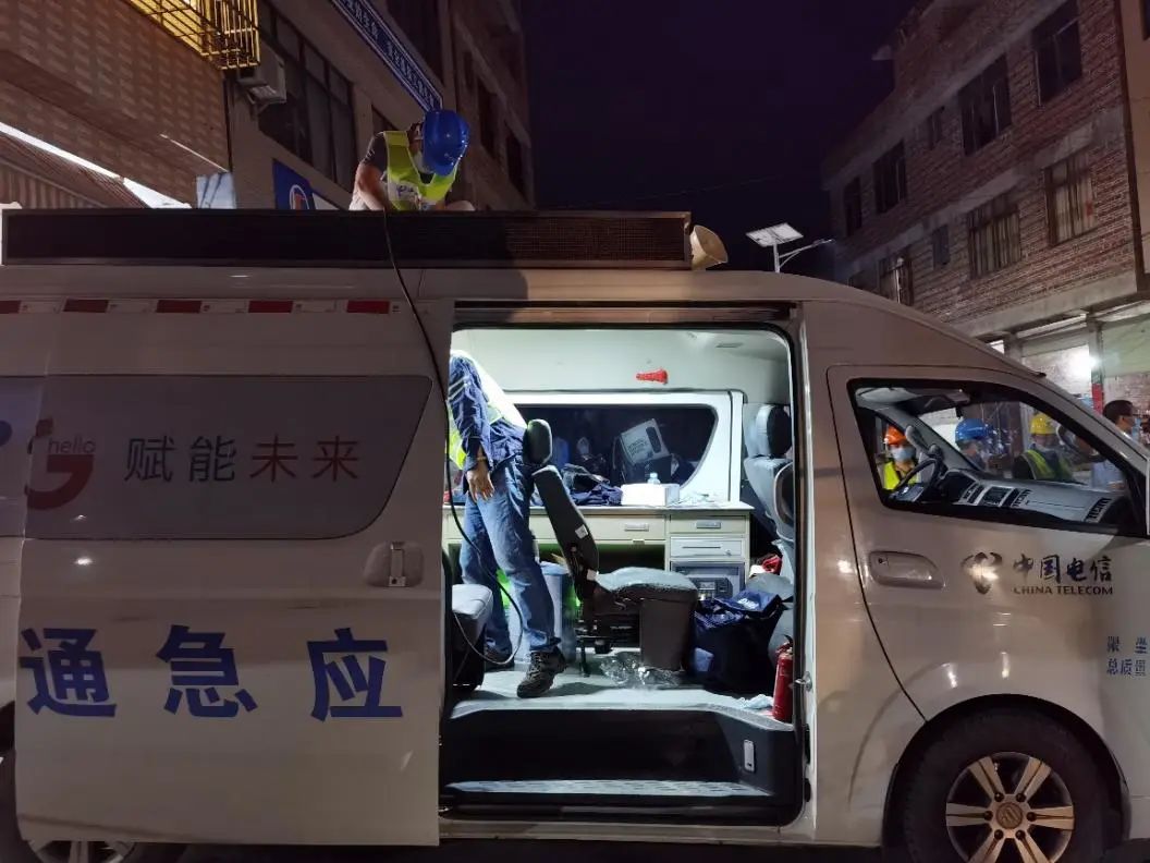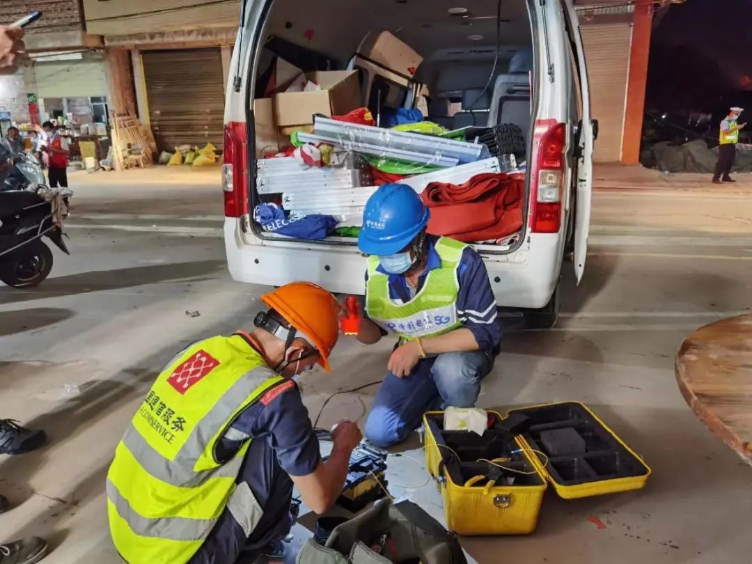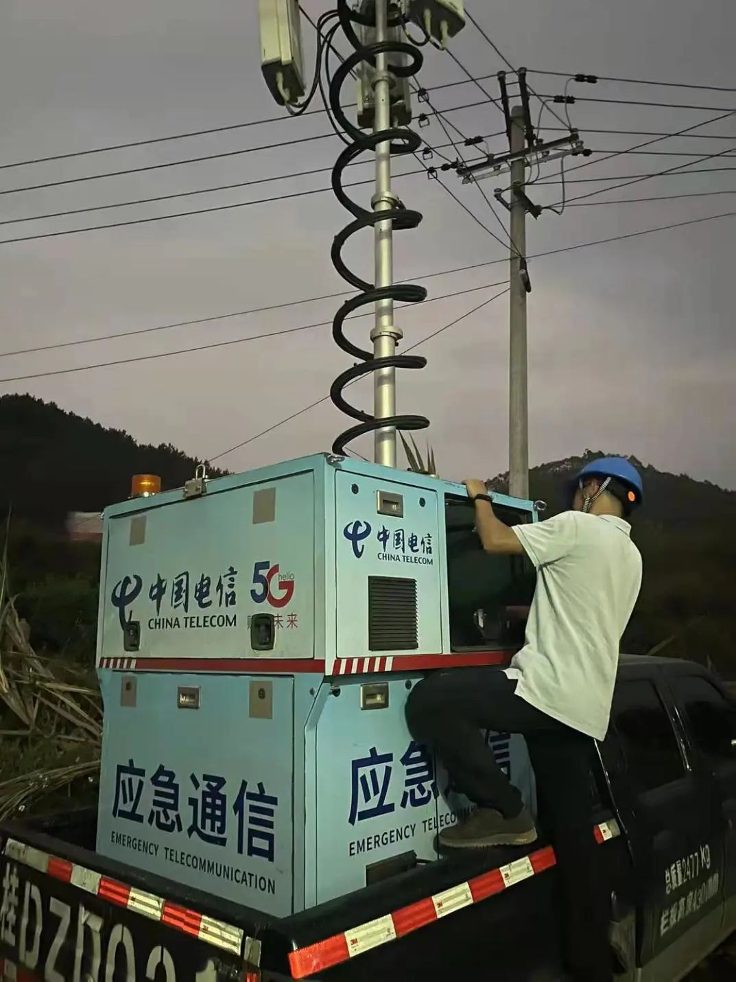 中國電信通信保障工作人員正在熔纖開通應(yīng)急基站