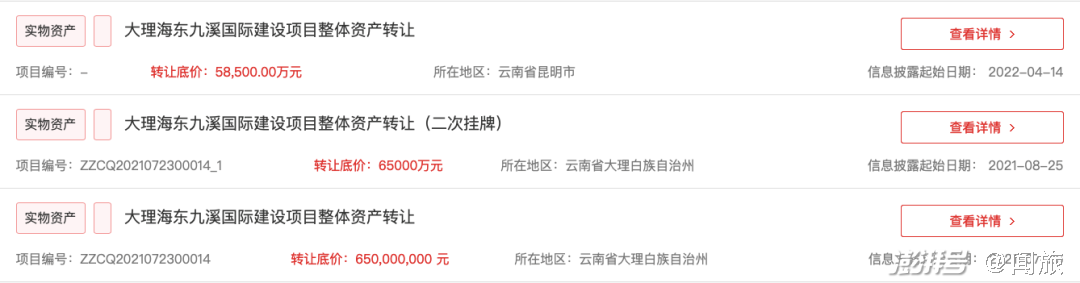 另一邊,大理海東開發(fā)投資集團分別于2021年7月和8月在云南產權交易所對九溪國際的整體資產進行轉讓,兩次轉讓的掛牌價均為6.5億元。