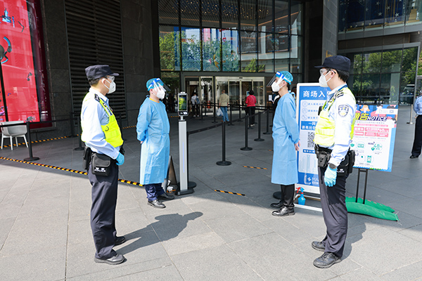 近日,小陸家嘴區(qū)域商超逐步恢復(fù)營業(yè),警方現(xiàn)場指導(dǎo)各項(xiàng)防疫工作。 本文圖均為 上海浦東公安 圖