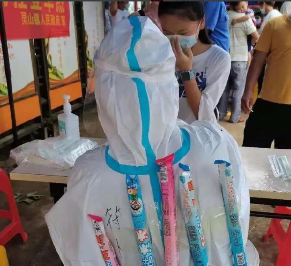 △炎炎夏日,堅守抗疫一線的醫(yī)護人員“背冰”上陣。