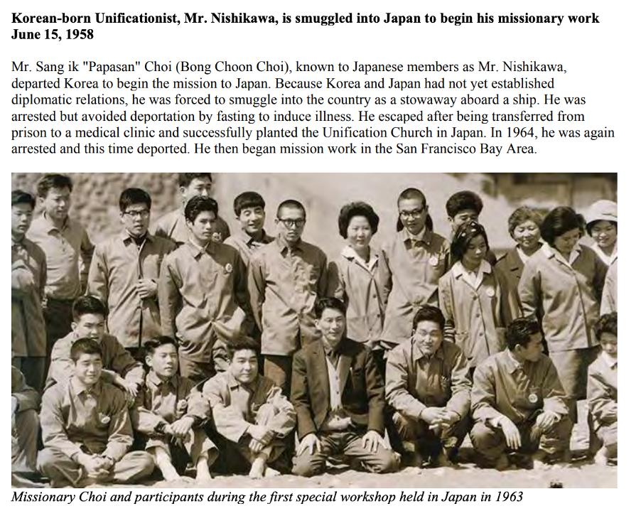 崔奉圣又名西川賢(音,Masaru Nishikawa),根據(jù)“統(tǒng)一教歷史編纂委員會”(FFWPU History Compilation Committee)電子檔案記載,崔于1958年6月(一說1958年7月)自釜山出發(fā)抵達(dá)東京,并于1959年10月舉行了首次“統(tǒng)一教會”祈禱儀式。由于日韓兩國其時(shí)并未建立外交關(guān)系,崔奉圣的日本之行并不順利,不得不坐船偷渡入境,多次面臨被警方逮捕的窘境。