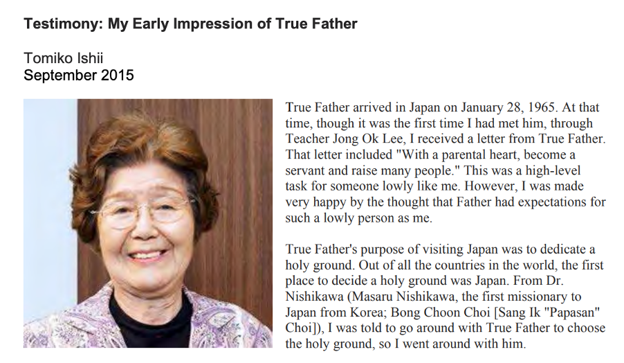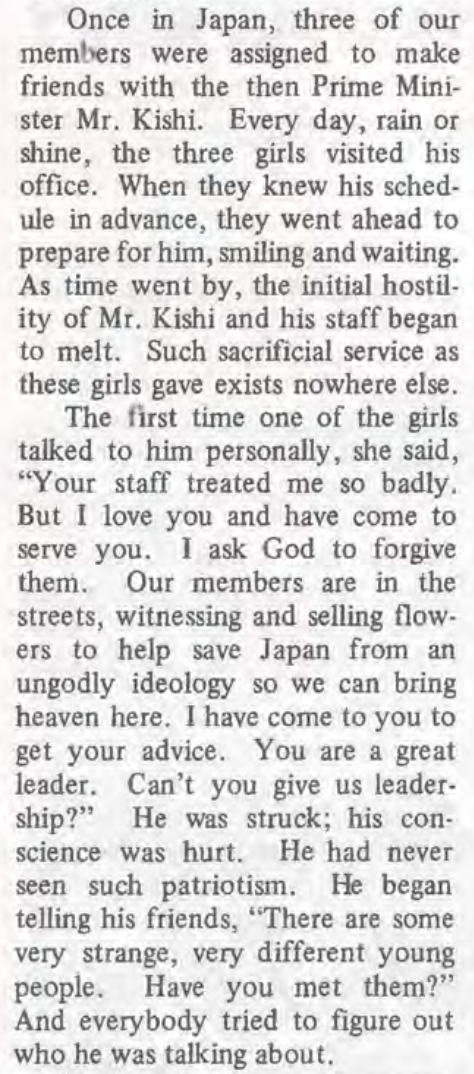 1974年1月,文鮮明在美國華盛頓特區(qū)附近的一場大型集會上發(fā)表題為《跟隨我們的天父》的演講,講述了3名女信徒與岸信介碰面的場景。他說道:“有一次,在日本,我們的3名成員被派去與時(shí)任首相岸先生交朋友。不論晴雨,這3名女孩每天都會造訪他的辦公室。當(dāng)她們提前得知他(岸信介)的日程,她們會直接去準(zhǔn)備,笑著等待。隨著時(shí)間過去,岸先生和工作人員最初的敵意開始融化。3名女孩提供的這種犧牲式的服務(wù)在其他任何地方都看不到。其中一名女孩第一次私下跟他(岸信介)交談時(shí),她說,‘您的工作人員對我們太不好了。但是我愛您,我來是為服務(wù)您。我請求上帝原諒他們。我們的成員正在街上見證著,他們通過賣花來幫助把日本從一種不敬畏神的意識形態(tài)中解放出來,這樣我們就可以把天堂帶來此處。我來是為獲得您的建議。您是一位偉大的領(lǐng)袖,您能給我們領(lǐng)導(dǎo)嗎?’他(岸信介)驚住了,他的良心受傷。他從來沒有見過這樣的愛國主義……”