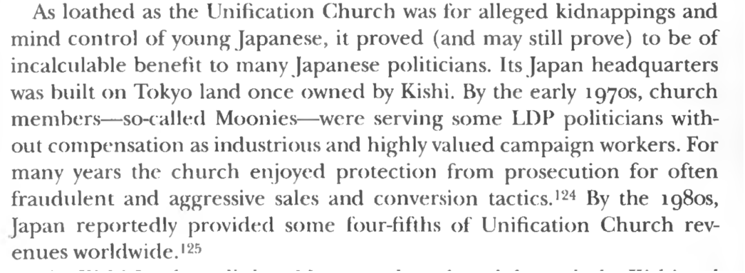 《馬基雅維利的孩子:意大利及日本領(lǐng)導(dǎo)人和他們的遺產(chǎn)》第245頁提及岸信介及其黨羽與“統(tǒng)一教會”的聯(lián)系。