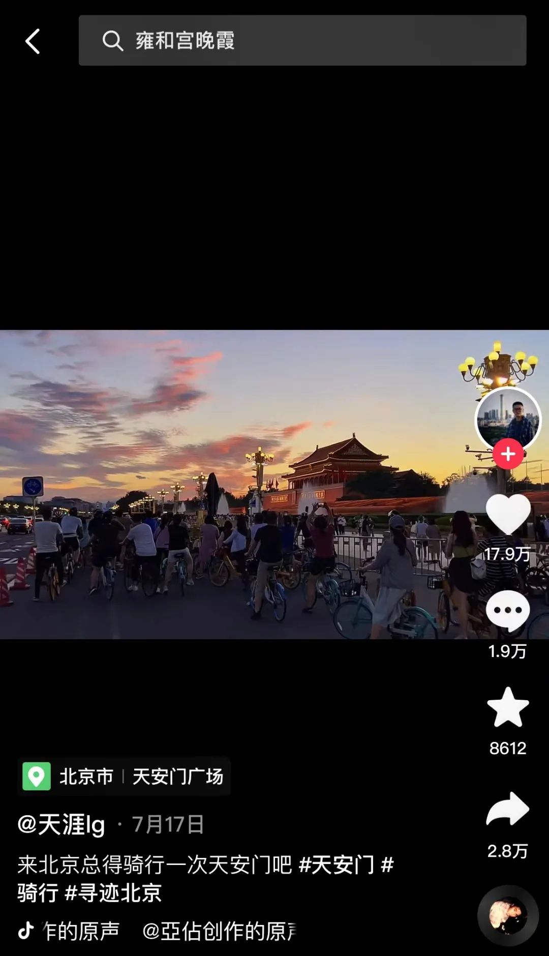 當(dāng)你走在北京的路上,你會發(fā)現(xiàn)北京從來不缺生活的活力。當(dāng)你搜索年輕人如何去體驗北京時,你會發(fā)現(xiàn)他們又愛上了古早的交通方式——自行車。你還能刷到他們分享的在瑰麗的晚霞下被燈光照耀的天安門廣場,那讓人產(chǎn)生“一輩子一定要去一次”的沖動的樣子,是只有騎行在北京的路上才能看到的風(fēng)景。