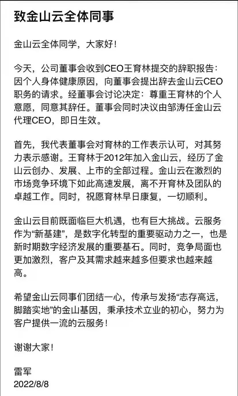 最新的例子是金山云。8月8日晚,兼職金山云董事長的雷軍對(duì)外發(fā)布了一封《致金山云全體同事》的公開信,信中宣布在2012年加入金山云擔(dān)任CEO一職的王育林,因個(gè)人身體健康原因遞交辭職報(bào)告,金山云副董事長鄒濤將接替王育林,出任代理CEO。